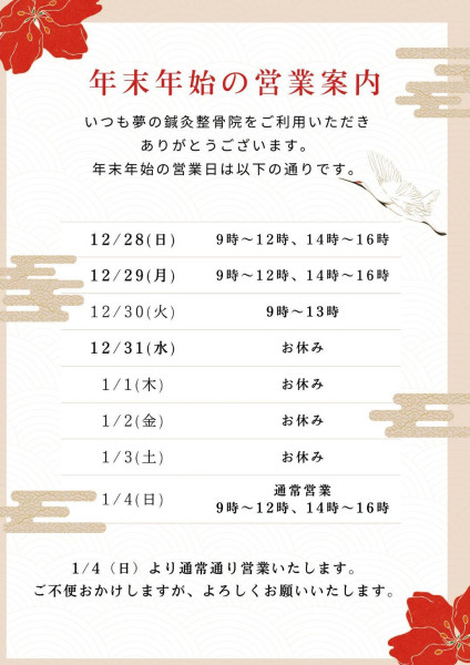 こんにちは!松戸市夢の鍼灸整骨院です。 仕事や家事に奮闘する30代から50代の皆様へ。年の瀬が迫り、忙しさがピークを迎えるこの 時期、ご自身の首・肩・腰の痛みや、長引く慢性疾患、坐骨神経痛、そして蓄積された疲労やむ くみ、頭痛といった不調を我慢していませんか? 特にこの世代は、肩関節周囲炎(四十肩・五十肩)や、気づかぬうちに進行している可動域(体 の硬さ)の制限が原因で、日常生活に支障をきたしているケースが多く見受けられます。 年末年始を気持ちよく迎えるためにも、今年の不調は今年のうちに解消することが何よりも大切 です。 年内は12月30日(火)まで営業しております。大掃除やお正月の準備で忙しくなる前に、ぜ ひ一度、ご自身の体と向き合う時間を作りにいらしてください。 年末年始の営業スケジュール ご予約の際にご確認ください。 12月28日(日)9時〜12時、14時〜16時 12月29日(月)9時〜12時、14時〜16時 12月30日(火)9時〜13時(午前のみの営業) 12月31日(水)休業 1月1日(木)休業 1月2日(金)休業 1月3日(土)休業 1月4日(日)通常営業開始 12月はご予約が大変埋まりやすくなります! 「年末に体をリセットしたい」「痛みを年越しさせたくない」というお考えの患者様が多くいら っしゃるため、12月は例年ご予約が大変混み合います。 ご希望の日時で確実に施術を受けていただくために、お早めにまとめてご予約をお取りいただく ことを強くおすすめいたします。 30日(火)は混雑が予想されます。ご予約はお早めにお願いいたします。 年明けの1月4日(日)以降の通常営業開始後も、すぐに混雑する可能性があります。 つらい首・肩・腰の痛みを解消し、体の硬さや疲労をリセットして、すがすがしい気持ちで新しい 年を迎えましょう!皆様のご来院を心よりお待ちしております。![]()